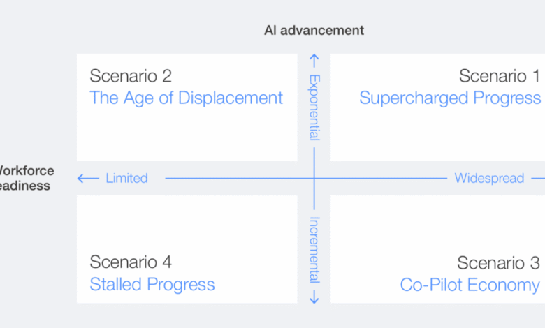 تقرير WEF يحدد أربعة مسارات محتملة لمستقبل الوظائف بحلول 2030، تتراوح بين اقتصاد يقوده الذكاء الاصطناعي وأتمتة مقلقة أو تكامل تدريجي ناجح، مع توصيات عملية للاستعداد.