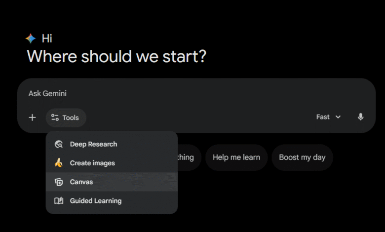 وتبدأ العملية بتسجيل الدخول إلى Gemini، ثم رفع المستند المراد تحويله إلى عرض تقديمي، سواء كان ملف PDF أو Word أو نصًا عاديًا. بعد رفع الملف، ينتقل المستخدم إلى قسم Tools ويختار أداة Canvas.
