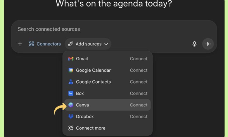لبدء الاستخدام، يمكن للمستخدمين الدخول إلى منصة كانفا وإنشاء قالب جديد أو اختيار قالب جاهز. ثم، من داخل شات جي بي تي، يمكن الضغط على رمز “+” > “Connectors” وربط الحساب الشخصي في كانفا.