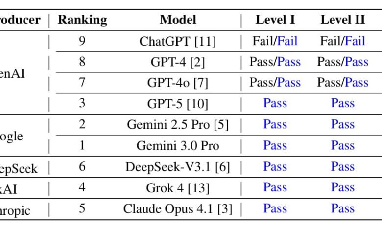 وسجّل Gemini 3.0 Pro رقمًا قياسيًا في المستوى الأول بنسبة 97.6%، تلاه GPT-5 وGemini 2.5 Pro، فيما تجاوز حتى أقل النماذج أداءً حاجز 90%. وقاد GPT-5 نتائج المستوى الثاني الذي يركّز على التحليل التطبيقي ودراسات الحالة، بينما تفوّق Gemini 3.0 Pro في المستوى الثالث، خاصة في الإجابات الإنشائية التي تتطلب تركيبًا معقّدًا واستدلالًا عميقًا.