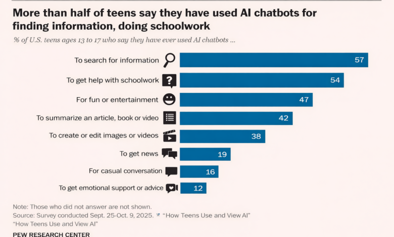 دراسة لمركز بيو تكشف أن 64% من المراهقين الأمريكيين يستخدمون روبوتات الدردشة المعتمدة على الذكاء الاصطناعي، نصفهم تقريباً لأغراض دراسية.