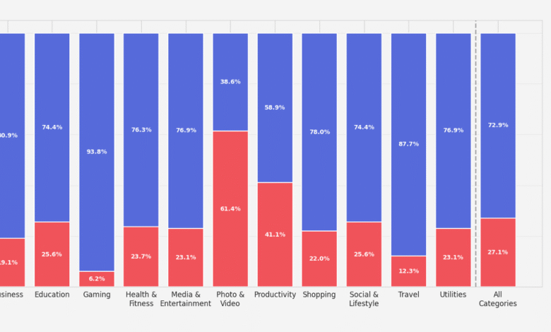 أظهر التقرير أن تطبيقات الذكاء الاصطناعي تمثل 27.1% من التطبيقات المحللة، بينما تشكل التطبيقات التقليدية 72.9% (بحسب المصدر). كما أن تطبيقات الذكاء الاصطناعي تفقد المشتركين السنويين بسرعة أكبر بنسبة 30% مقارنة بالتطبيقات التقليدية. وتجدر الإشارة إلى أن معدل الاحتفاظ السنوي يبلغ 21.1% للتطبيقات المدعومة بالذكاء الاصطناعي مقابل 30.7% للتطبيقات التقليدية (بحسب المصدر). في المقابل، تتفوق تطبيقات الذكاء الاصطناعي في تحويل الفترات التجريبية المجانية إلى اشتراكات مدفوعة بنس��ة 52% أفضل من التطبيقات التقليدية.